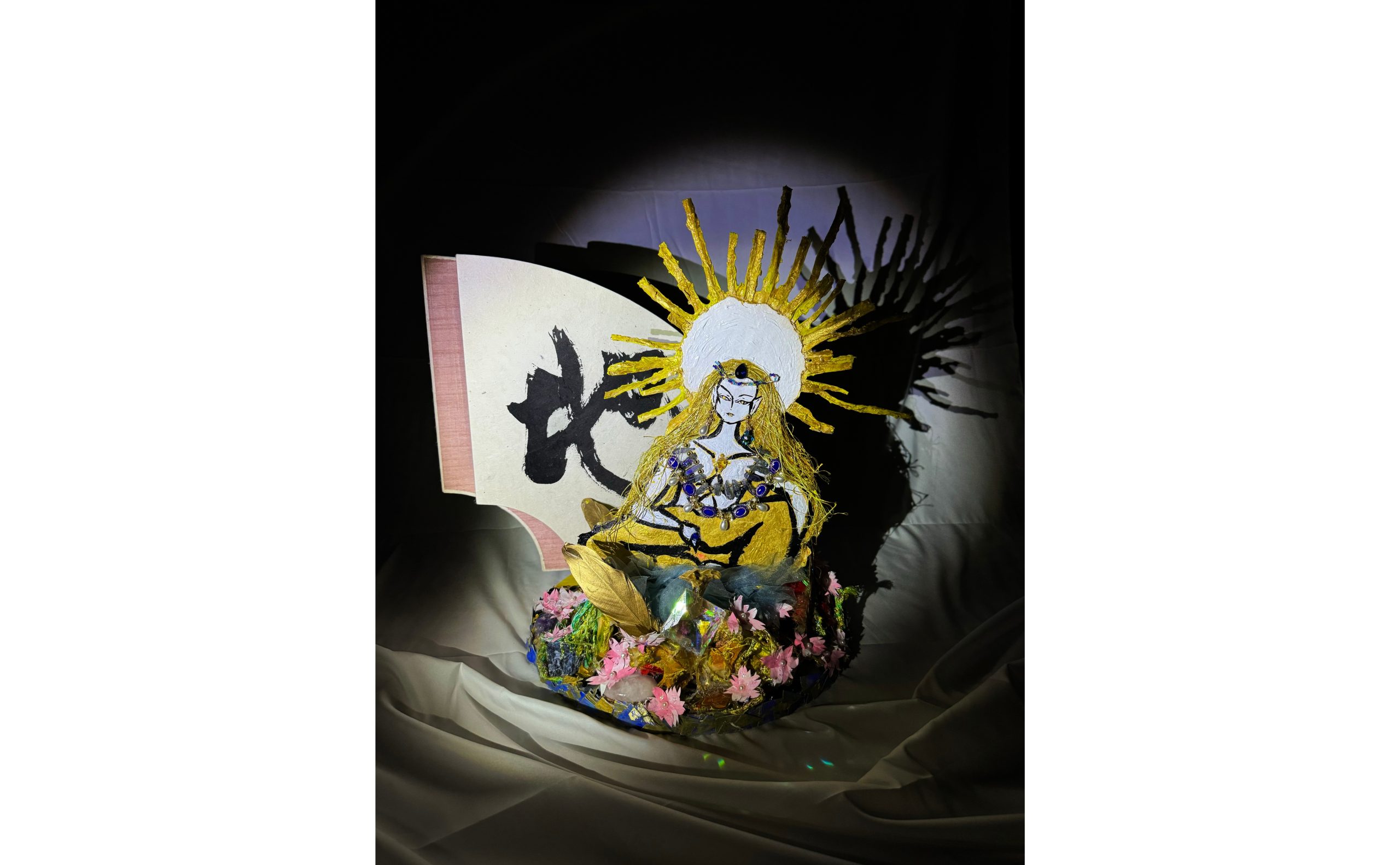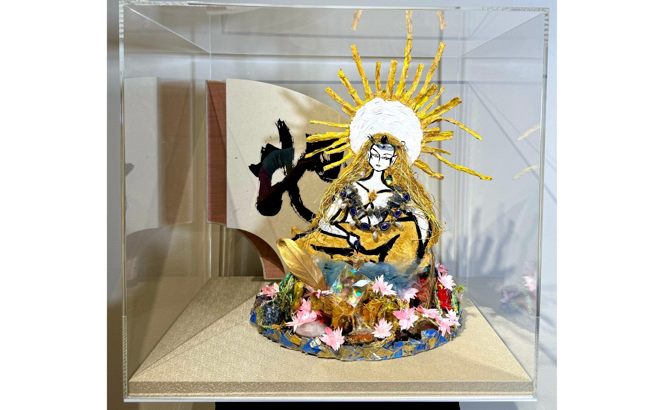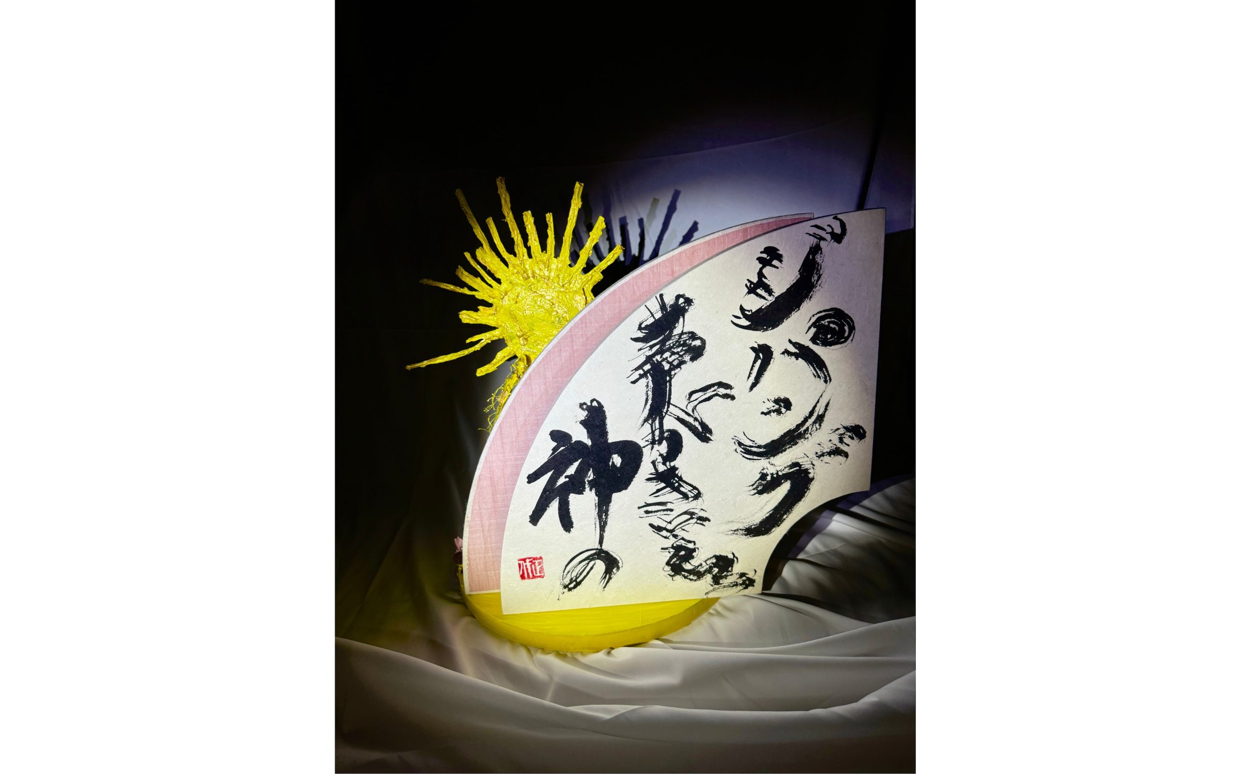 作品には地震で壊れた輪島塗のパーツが使用され、能登の美しい未来をお願って製作されました。 本作品は対作品となっており、もう一つは、8/1に能登の重蔵神社に奉納され、神社が修復されるまでは、 輪島塗塩安工房で保管中です。神社が再建すると、その作品も神社でご覧いただけるようになります。 一対タイトル: 神の声が聴こえるジパング 作品タイトル: This is Japan 作品の登場人物: アマテラス、日向(邪馬台国の卑弥呼)、大国主、天之冬衣神、能登の人々 ストーリー: 日本の始まり (原点) 日の国、日本、自然(じねん)と共に生きて来た。 じねんと共に生き、 そして共に死ぬ。 自然、祈り、命、魂は皆一つ。 忘れる事なかれ。 解説: 出雲から能登を作った神々大国主、 天之冬衣神を祀る重蔵神社。今回の作品では、1300年前に作られた古事記の続きを書いてみました。 地の神々に天照大神から祝福と天に通じる箱舟に能登の人々の魂、希望、喜び、勇気、愛を乗せて音と共に 上がっていく様を作品で表現しました。