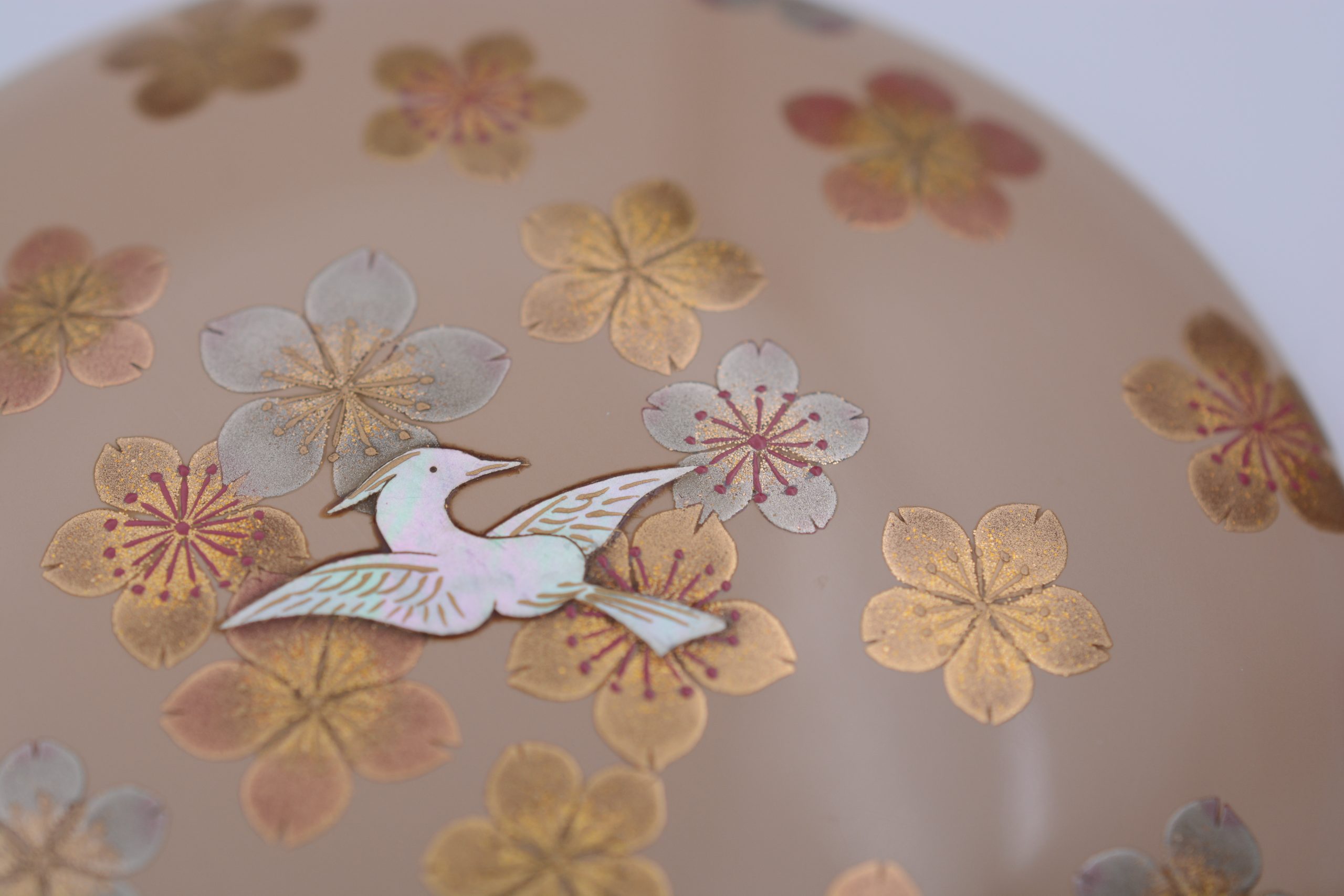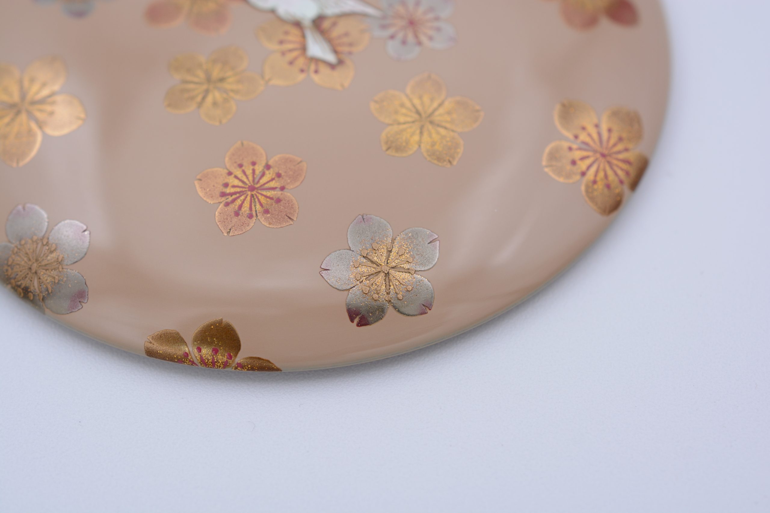 「持ち歩き出来る蒔絵」をコンセプトに制作しました。明るい白漆を塗ったのち、伝統的な桜の花を金や銀だけでなく色漆を使って多彩に描きました。真ん中には瑞鳥を白蝶貝であしらい全体で花喰鳥文様をあらわしています。