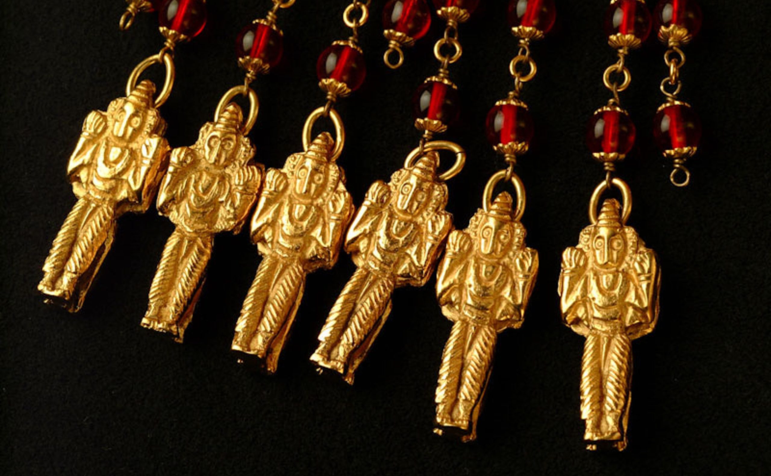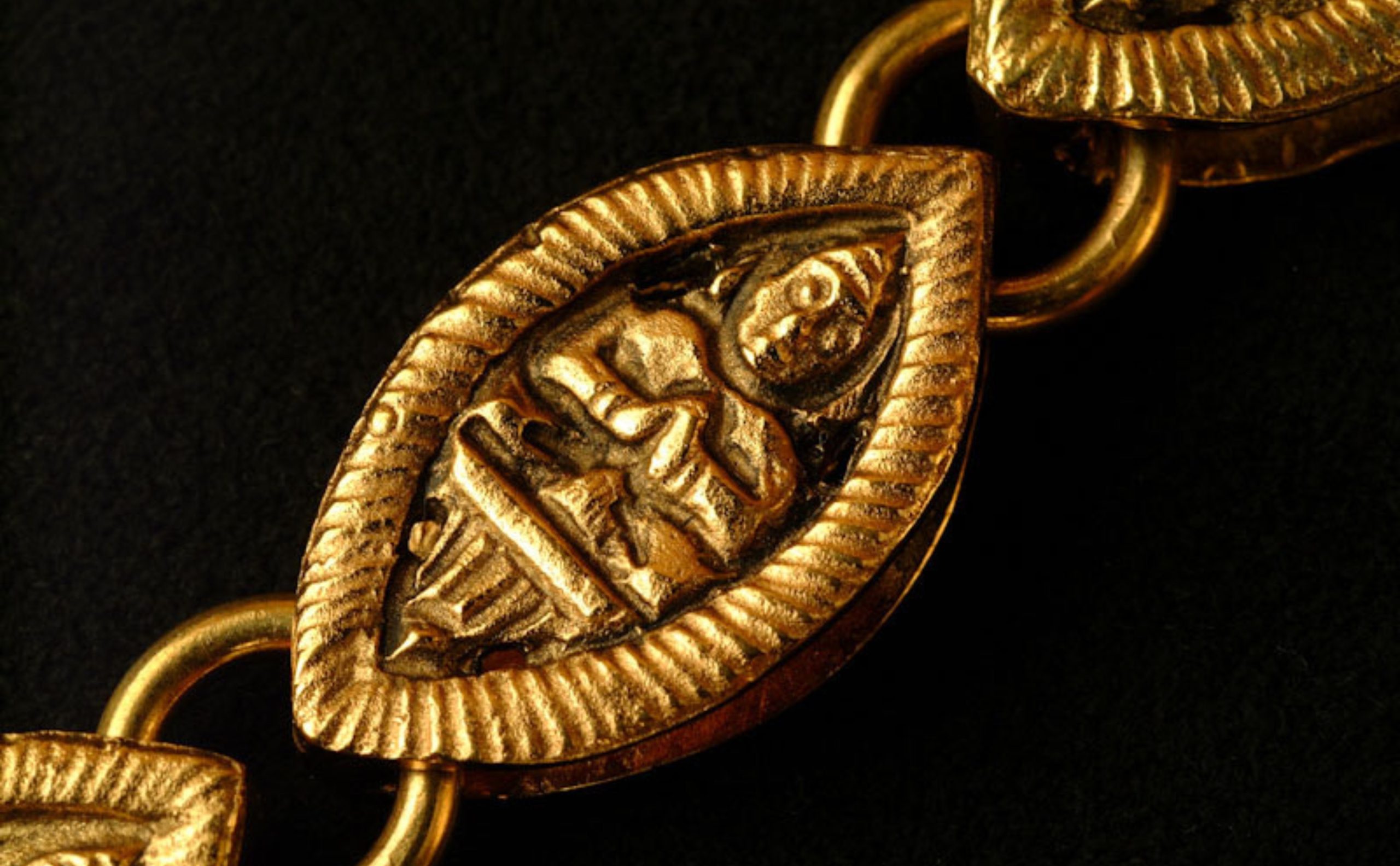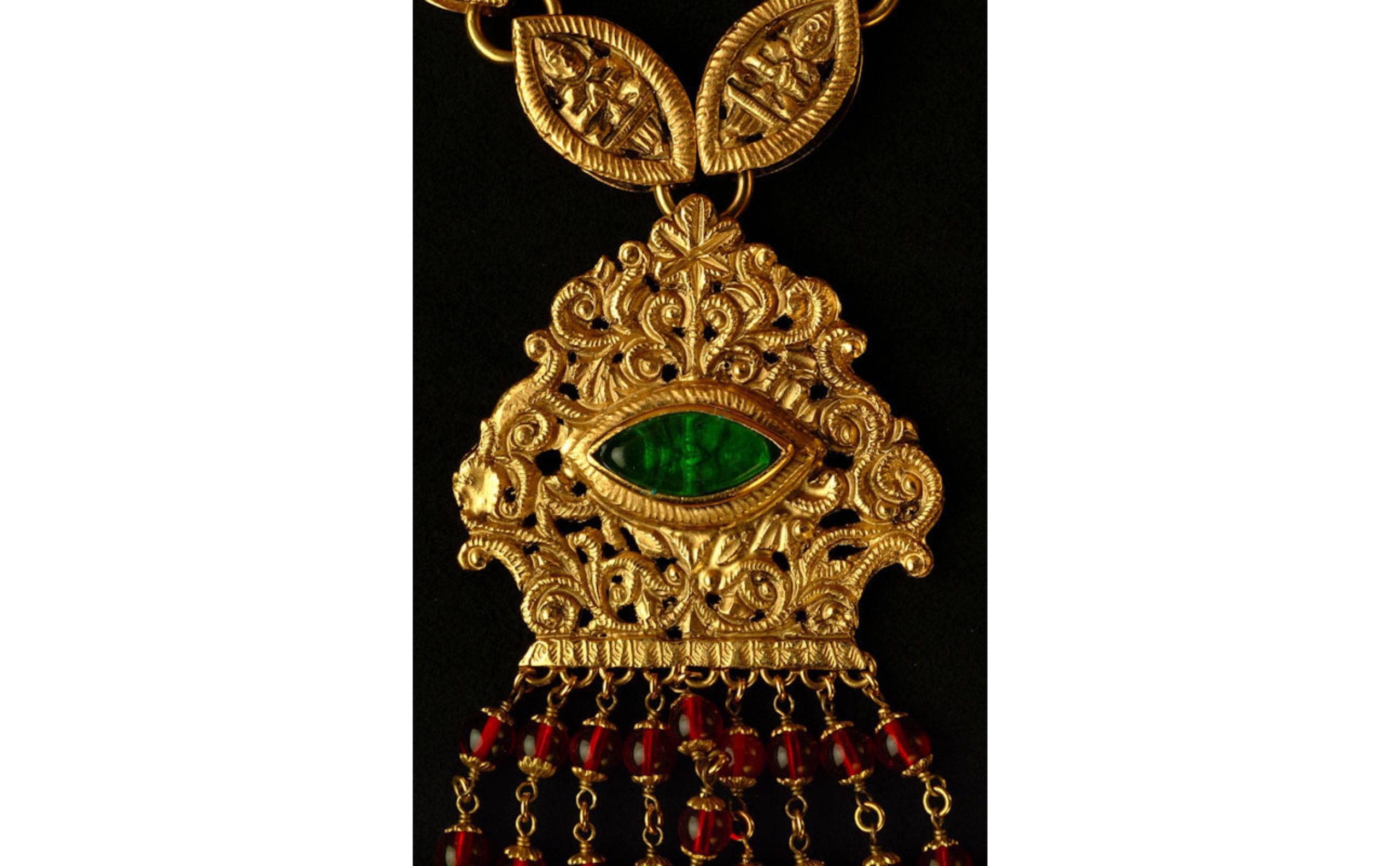 東インド文明の影響を受けた作品。象徴的な模様が透かし彫りにされた船形のチェーンのネックレス。ペンダントヘッド部分は、中央に船形の緑のペーストガラスをあしらった透かし彫りからは、葉飾りのついた赤いガラスビーズが9列に垂れ下がり、間隔を空け交互に先端には人物像がほどこされている。シャネルのサインが刻まれている。